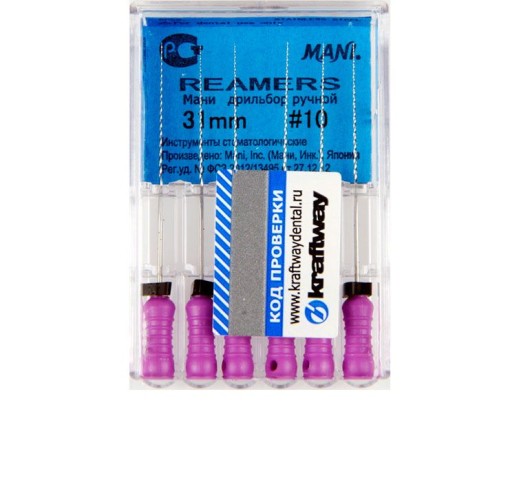Ример № 10 Mani – инструмент, предназначенный для ручной обработки зубных каналов. Он позволяет очищать их, расширяя и формуя, подготавливая к промывке и герметизации. Длина 31 мм позволяет работать с любыми, в том числе, искривленными каналами.